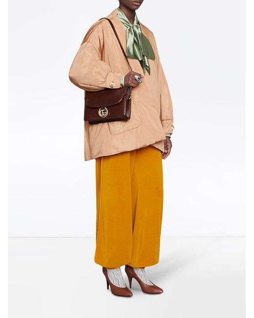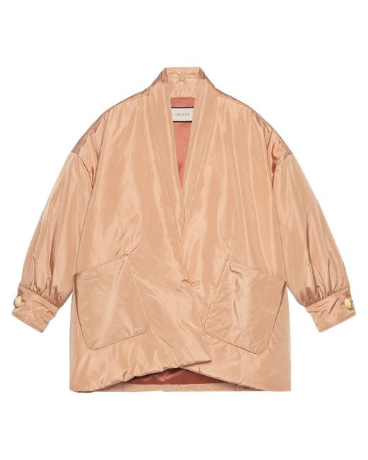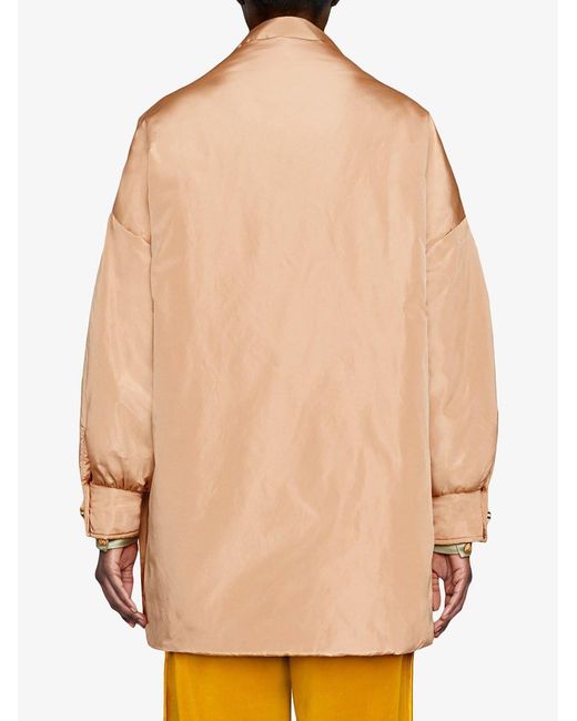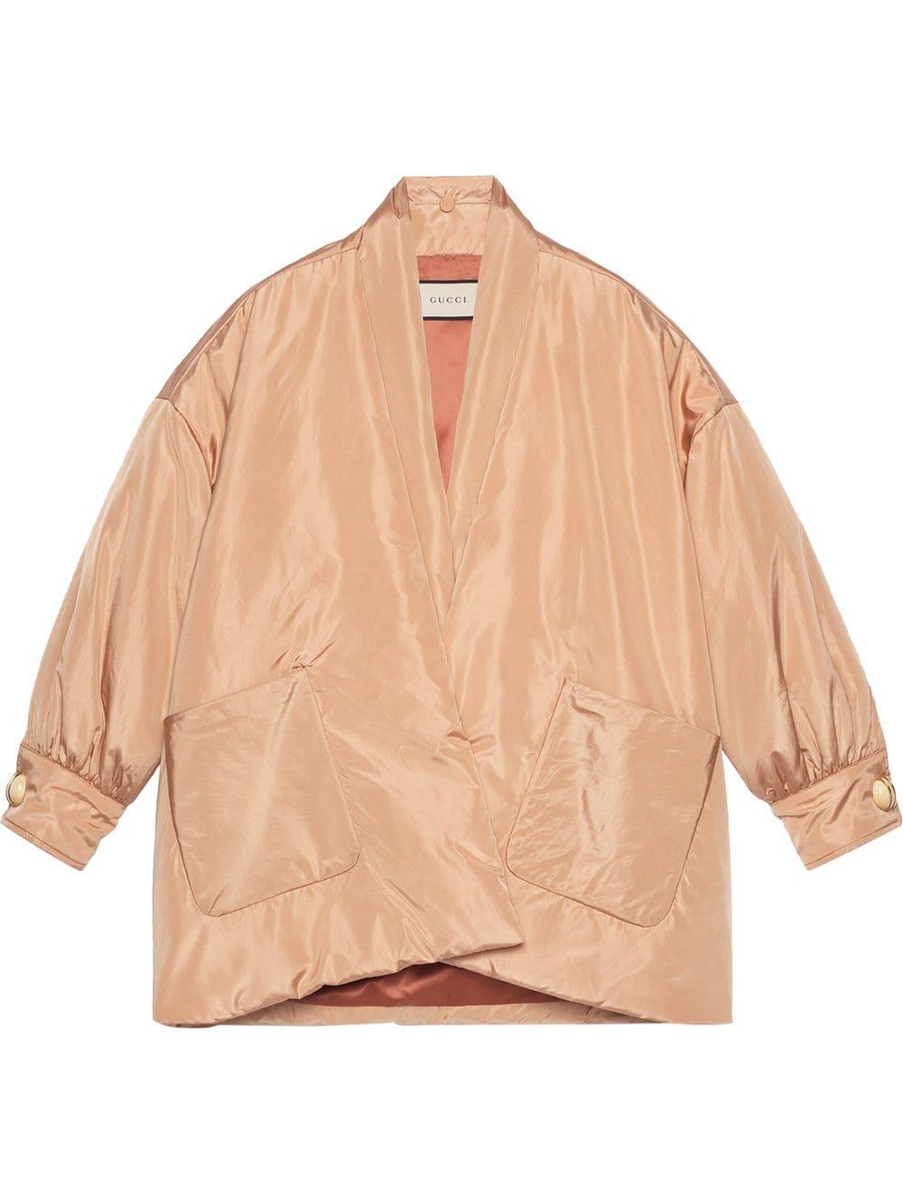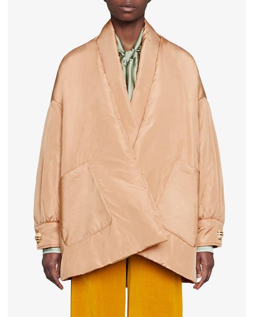 Oversized-Daunenjacke aus Seide von Gucci. Merkmale: umgeschlagener Bund, V-Ausschnitt, lange Ärmel, Eingriffstasche vorne und Knopfmanschetten. Farbe: natur