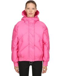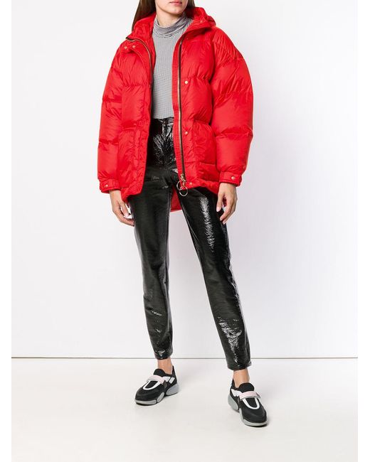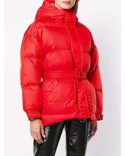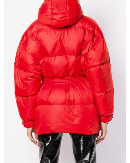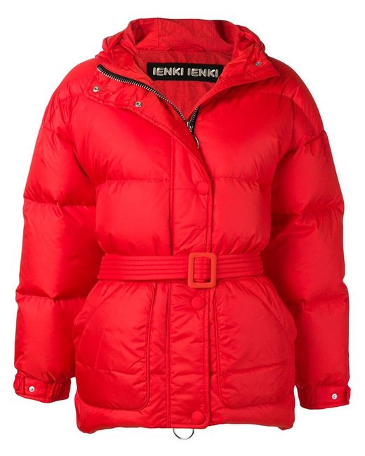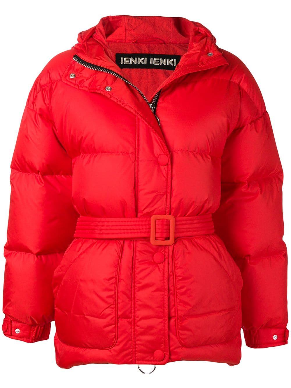 Oversized-Daunenjacke mit Gürtel von Ienki Ienki mit folgenden Eigenschaften: Kapuze, Stehkragen, Taillengürtel, variable Passform, gesteppt und lockerer Schnitt. Farbe: rot