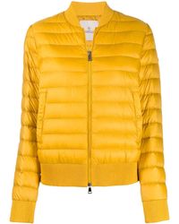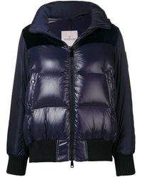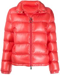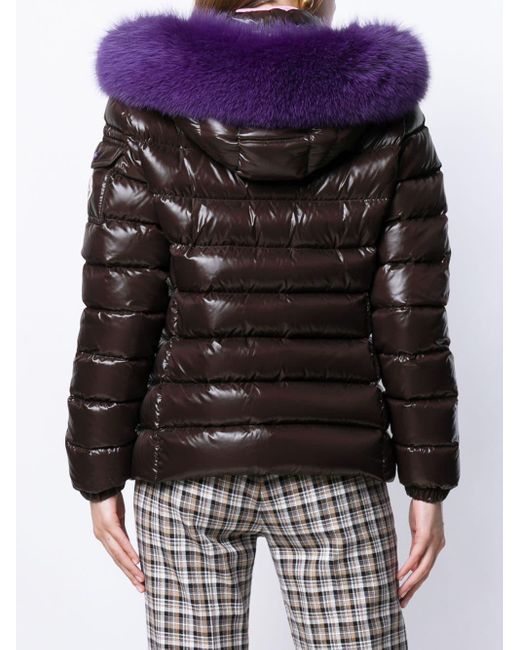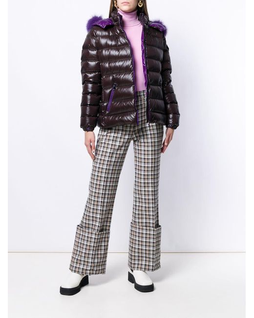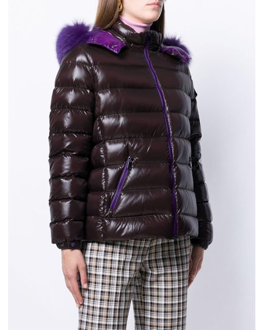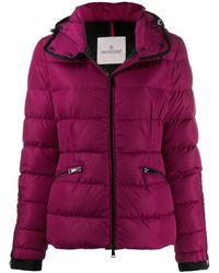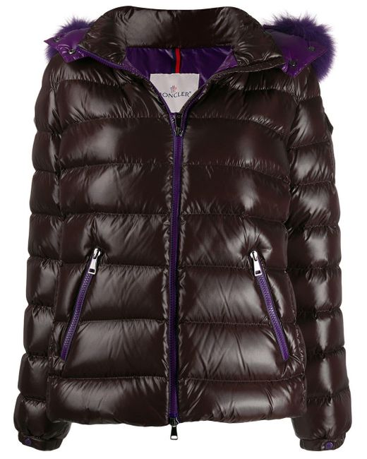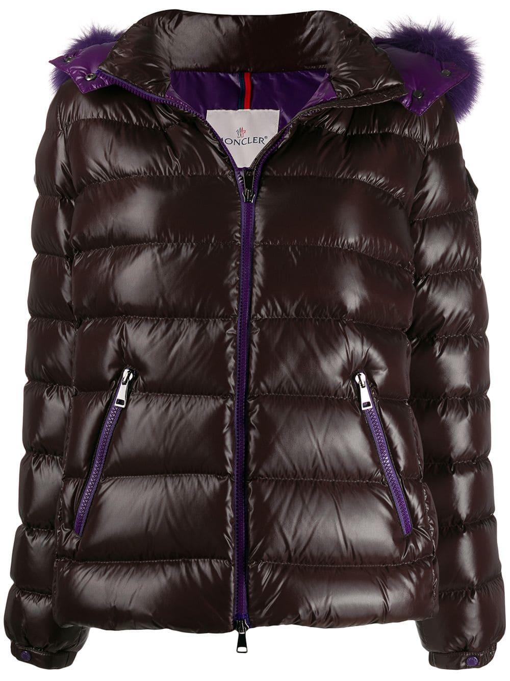 Gesteppte Jacke von Moncler. Merkmale: Kapuze mit Kunstfellbesatz, gepolsterte Innenseite, Reißverschluss an der Vorderseite und Vordertaschen mit Reißverschluss. Farbe: lila