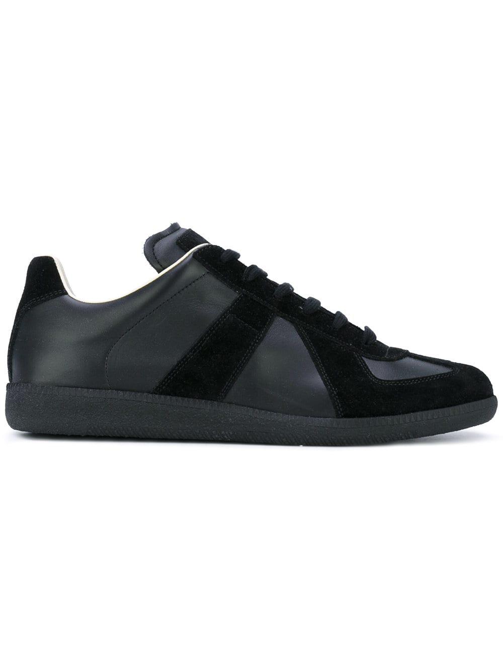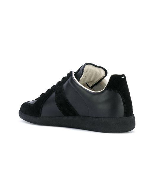 Schwarze 'Replica' Sneakers aus Leder und Wildleder von Maison Margiela mit folgenden Eigenschaften: runde Kappe, flache Sohle, Schleifenverschluss, Logo-Patch an der Zunge, Logo-Prägung im Fußbett und charakteristische weiße Nähte hinten. Farbe: schwarz