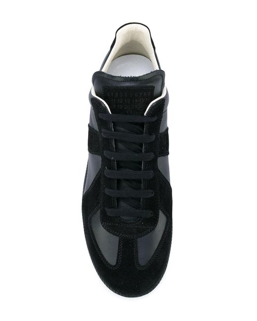 Schwarze 'Replica' Sneakers aus Kalbsleder und Leder von Maison Margiela mit folgenden Eigenschaften: runde Kappe, Schnürung vorne, Zunge mit Logo-Prägung, Logo-Prägung im Fußbett, gepolsterter Knöchel, charakteristische weiße Nähte hinten, Einsatz mit geometrischem Muster und Gummisohle.