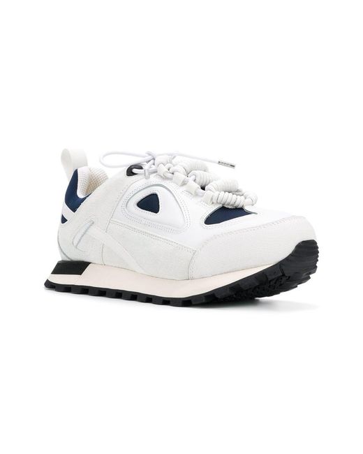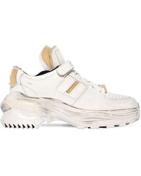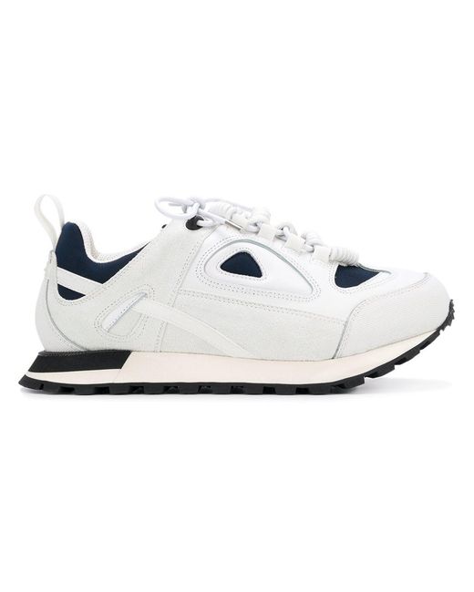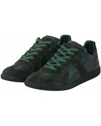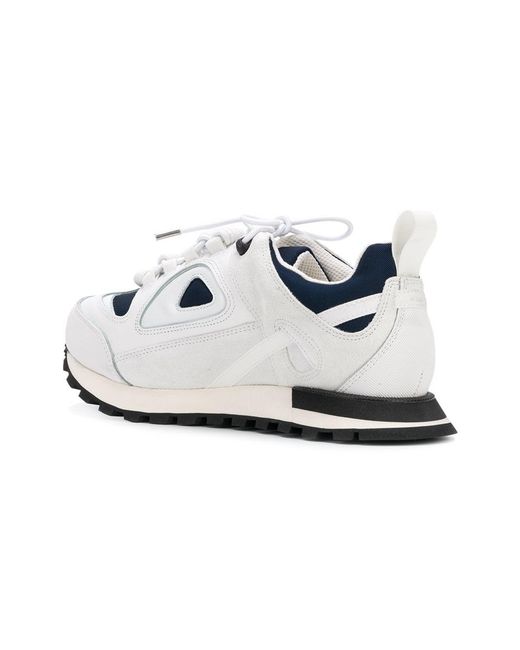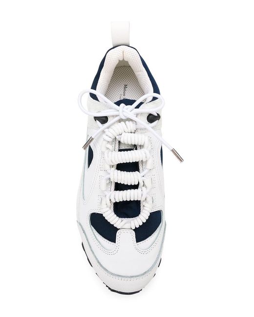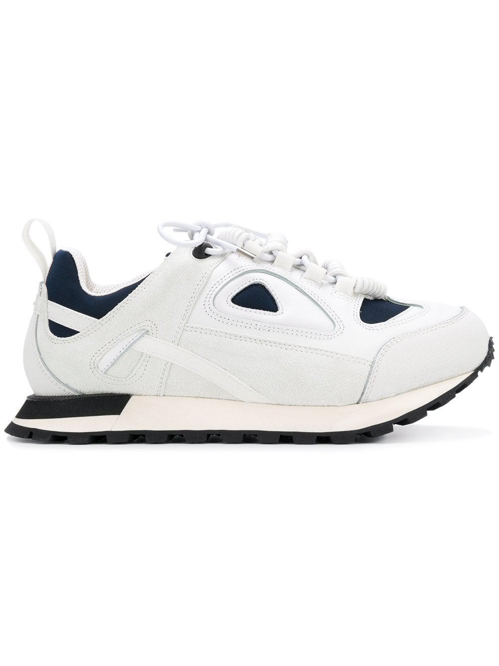 Schwarz-dunkelblaue-weiße 'Twist' Sneakers aus Baumwolle, Leder und Wildleder von Maison Margiela mit folgenden Eigenschaften: runde Kappe, flache Gummisohle, kontrastfarbige Einsätze, Schnürung vorne, Lasche an der Ferse und Logo-Prägung im Fußbett. Farbe: weiß